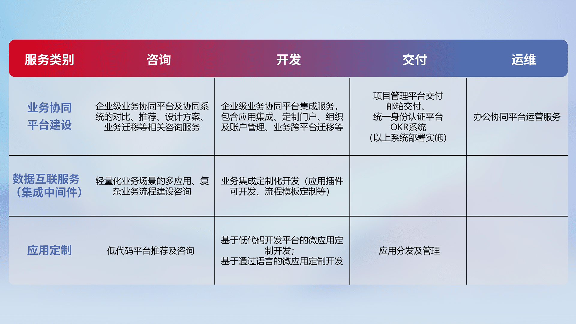 针对钉钉、、企微、、、、IDaas等平台级产品提供产品的规划、、方案、、、、交付、、定制化开发等服务,,,,实现如统一协同办公、、、智能客户服务、、、混合会议管理、、、、智能数据查询、、等业务场景,,,实现数字化转型。。。。